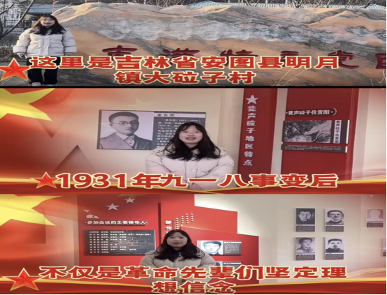一批同学主动踏上红色热土,在历史现场接受精神洗礼。大数据专业马兰同学前往甘肃,实地探访卫国戍边英雄事迹,将书本上的抽象概念转化为血脉相连的敬意,深刻理解了红色基因传承的时代意义。2025级市场营销专业赵雪婷同学以“重走东满抗日策源地”为主题,通过实地探访、史料研读,系统梳理了瓮声砬子会议的历史价值,在先辈奋斗过的土地上厚植了爱国情怀。2025级国际经贸专业赵耀同学在准备董存瑞英雄事迹视频创作的过程中,通过交叉比对史料,锻炼了信息甄别能力,更被英雄超越小我的精神深深震撼。这些实践活动,是生动的“大思政课”,筑牢了青年学子的信仰之基。
